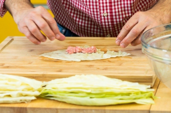 Do hrnce dáme vařit vodu se solí. Zelí zbavíme košťálu a dáme ho do vroucí vody. Až se začne zelí vařit opatrně z něj snímáme vnější listy. Listy zbavíme tvrdého středu a rozpůlíme je. K mletému masu přidáme omytou rýži, přilijeme slunečnicový olej a nazávěr maso osolíme a opepříme. Zelné listy naplníme masovou směsí a srolujeme. Tvrdé středy ze zelných listů poklademe na dno hrnce, kde budeme vařit závitky. Zabráníme tím připalování závitků zespoda. Na závitky nalijeme vývar ze zelí a navrch dáme česnek. Závitky zatížíme. Až se závitky začnou vařit, snížíme teplot na minimum. Vaříme je dále zhruba hodinu. Do vývaru zelí přidáme rajčatový protlak a přilijeme to k závitkům. Opatrně zamícháme. Nakonec uvařené závitky vyndáme z hrnce a vývar z nich přelijeme do mísy. Ten použijeme jako omáčku k zelným listům.